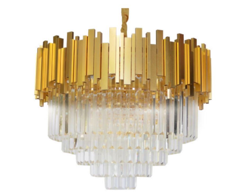 PENDENTE EM CRISTAL K9, METAL DOURADO, 07 SOQUETES E-14.