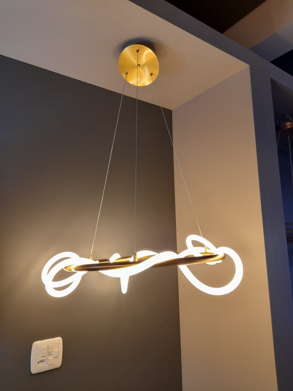 LUSTRE EM ALUMÍNIO NA COR DOURADO, COM LED INTEGRADO NEON NA COR BRANCO QUENTE 3000K. ALTURA DOS CABOS 1,20 METROS E DIÂMETRO 60CM, POTÊNCIA DO NEON 26W